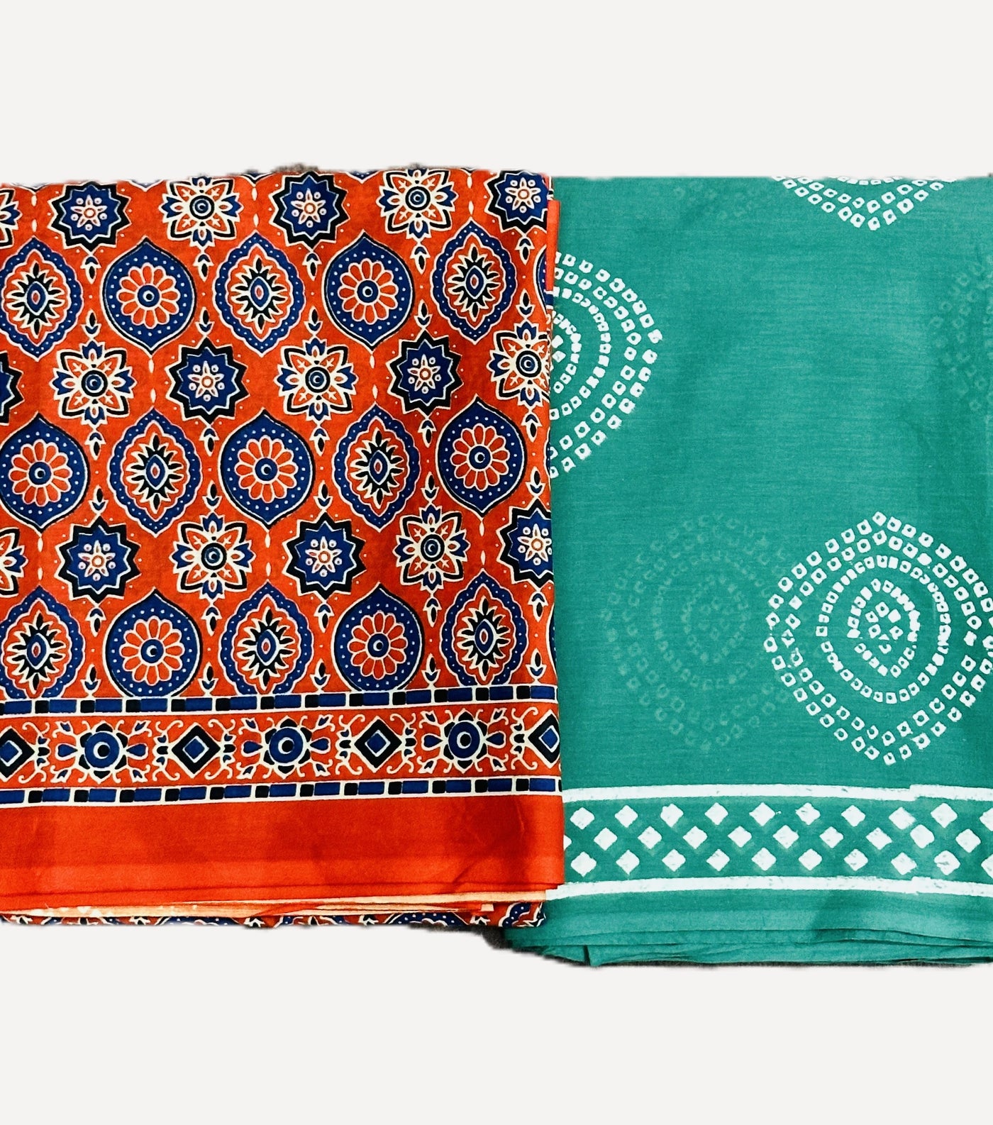 This cotton saree combo brings together a bold red drape blooming with intricate floral medallions and a soothing teal saree adorned with delicate circular motifs. Bright yet balanced, festive yet effortless — this duo is made for women who love colour with character.