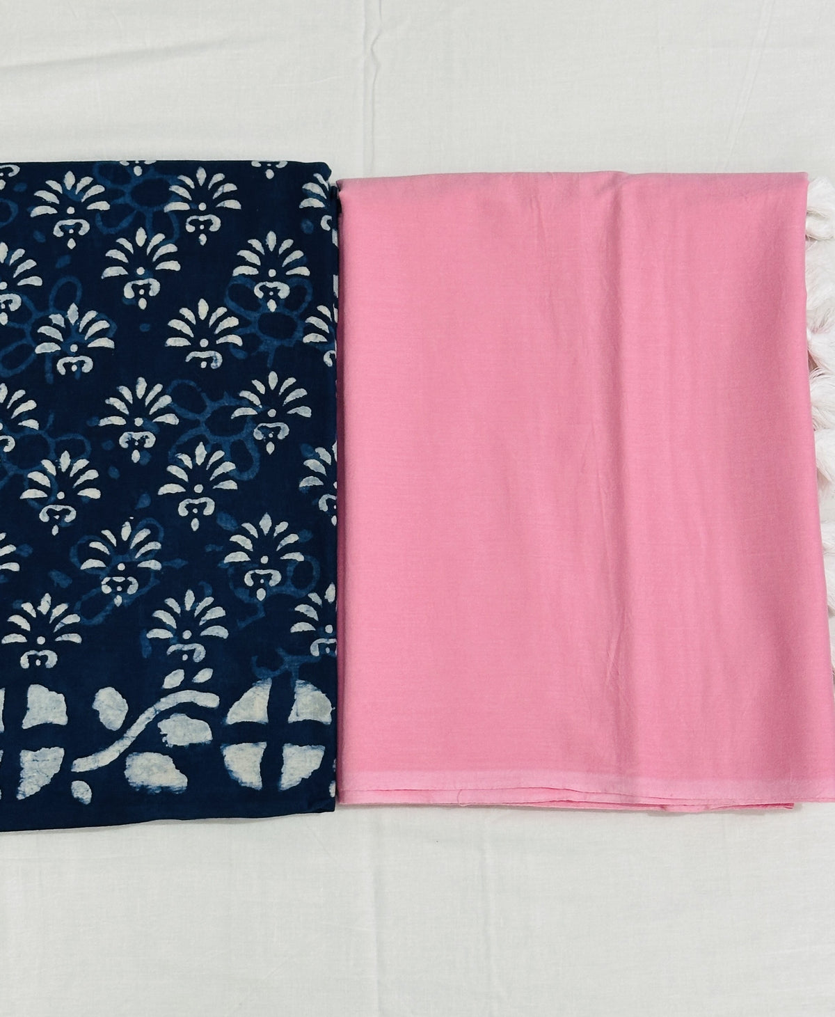 This cotton saree combo pairs a deep indigo handblock-inspired print with a delicate baby pink solid drape. Bold yet tender, artistic yet minimal — made for women who love effortless grace with a hint of playfulness.