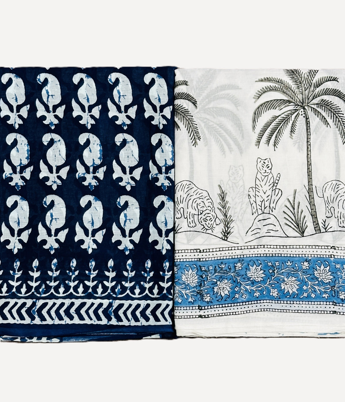 This cotton saree combo blends deep blue traditional motifs with a serene ivory drape featuring palm trees and tiger illustrations. Rooted in craft, inspired by nature — this duo is for women who carry heritage with a free spirit.