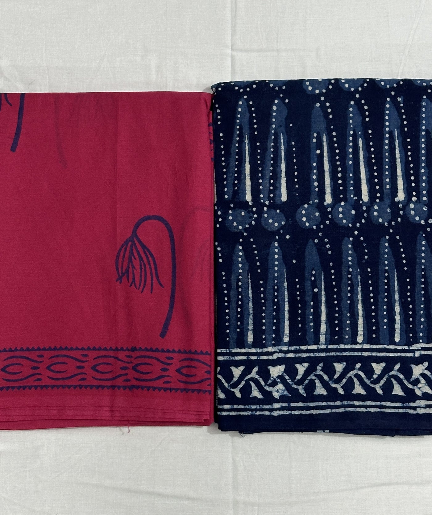 A vibrant pink cotton saree with minimal handblock motifs paired with a deep navy saree featuring bold traditional prints. One feels playful and bright, the other rooted and powerful — a perfect everyday mood switch.