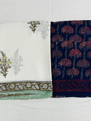 This cotton saree combo pairs a soft ivory drape adorned with delicate floral motifs and earthy borders, with a deep navy saree blooming in bold palm prints and rich red accents. Subtle meets striking, calm meets charisma — a duo for every mood you carry.
