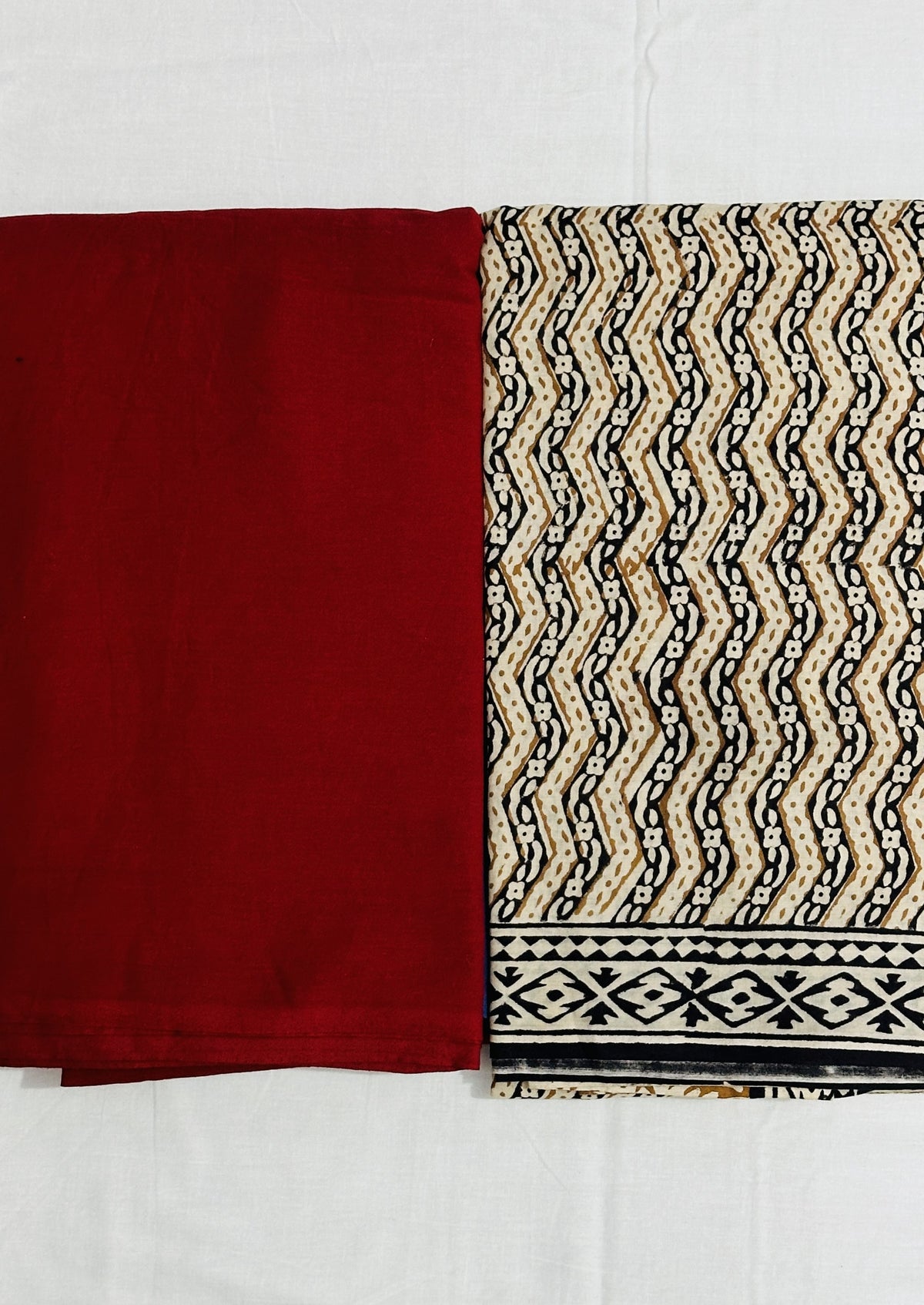 This cotton saree combo brings together a striking solid red drape and a classic black-beige wavy handblock print. Minimal yet powerful, rooted yet modern — this duo is made for women who carry grace with strength.