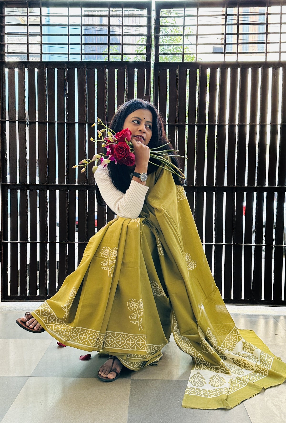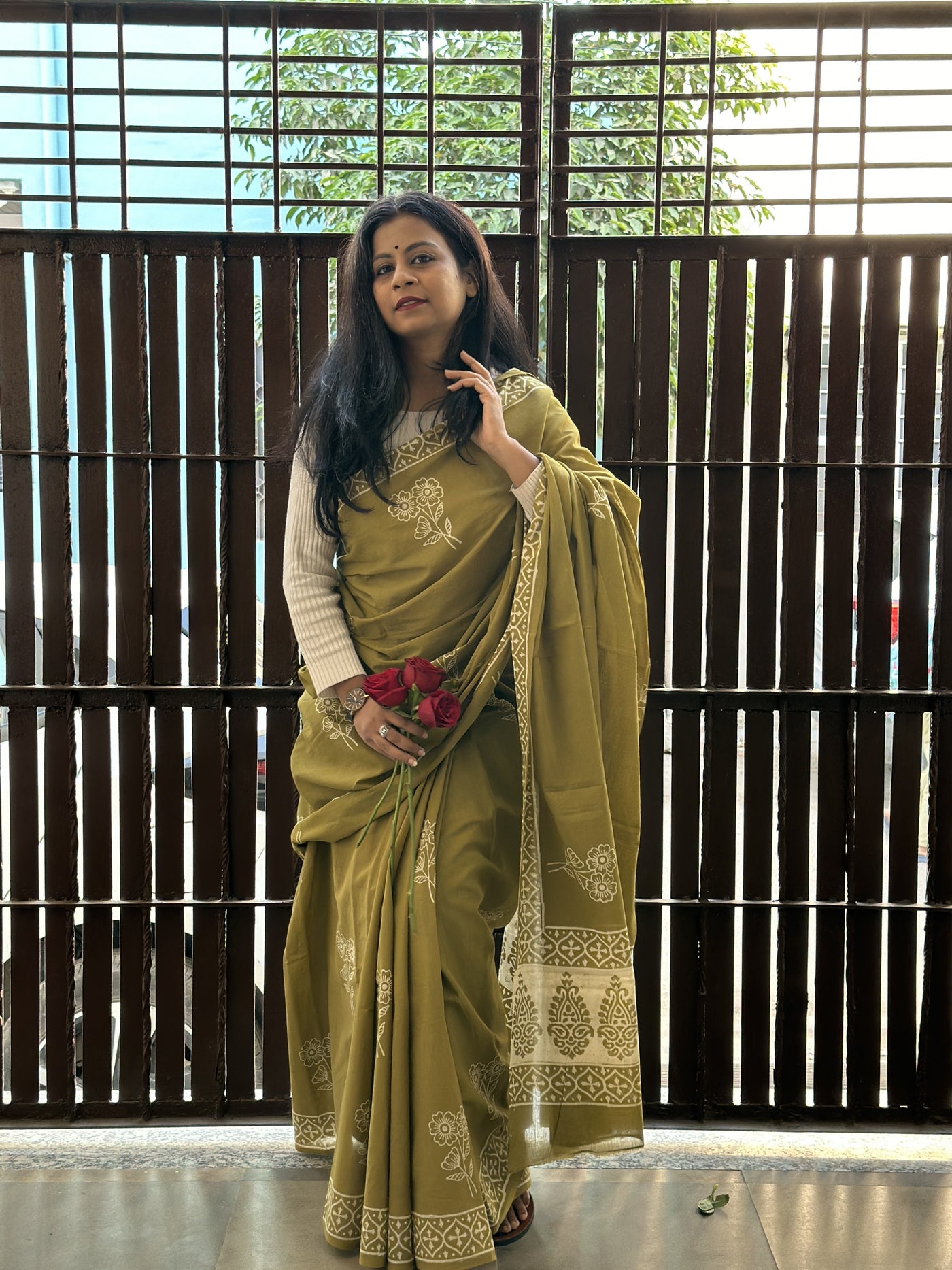 This heena-green saree carries the warmth of freshly drawn mehndi—soft, grounding, and full of feeling. Light on the skin and easy to drape, it blends tradition with everyday ease. The olive-green tone feels rooted yet refined, perfect for moments that call for subtle celebration.
