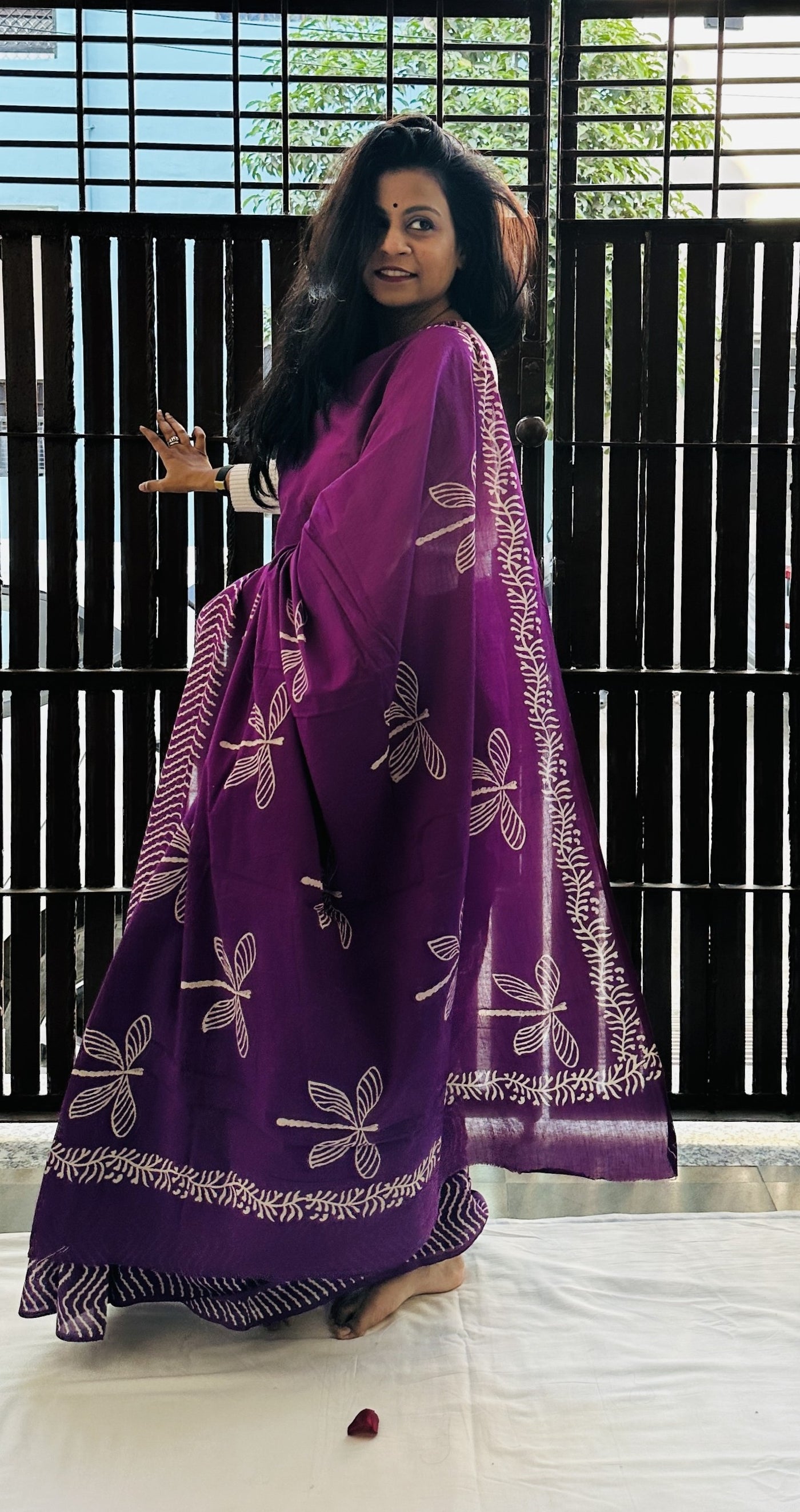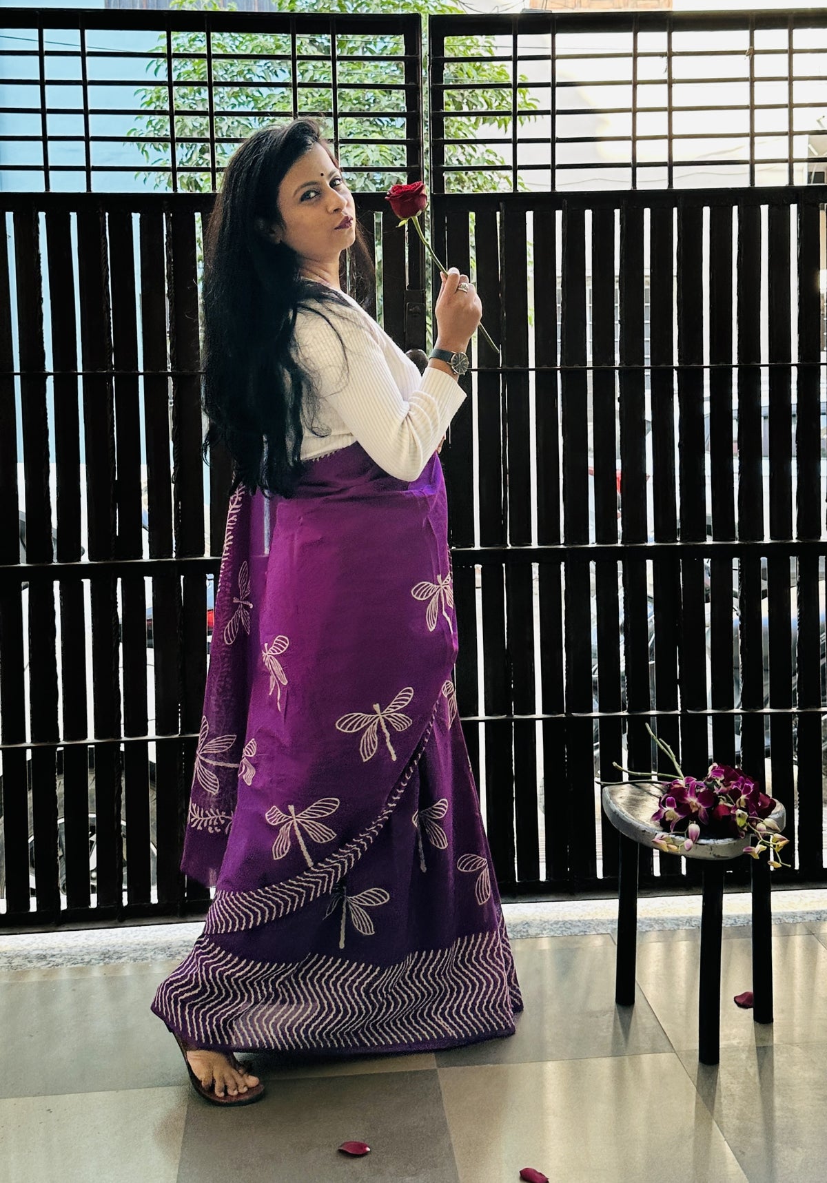 This purple saree dances with delicate butterfly prints, capturing the feeling of soft afternoons and free-spirited moments. Easy on the skin and effortless to drape, it brings a sense of movement, joy, and gentle charm to everyday dressing.
